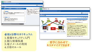 大学における情報セキュリティの基礎知識の習得を目的としたeラーニングです。大学の教職員に必須な4分野で構成されています。それぞれの大学様に合わせてカスタマイズできます。