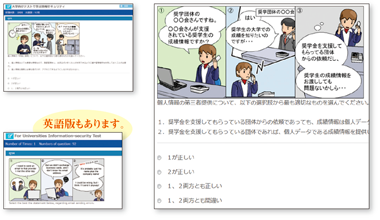 テスト形式で情報セキュリティを学習するeラーニングです。ご要望に応じて組み合わせた分野、問題数で実施できます。日々の業務に忙しい教職員の方々に、負担がかからないよう教育を実施したい、という教育担当者様のお悩みに対応し、教育が特に必要な分野、問題のみ10~20問程度を選択していただき、10分程度の短時間での実施も可能です。スマートフォン・タブレット端末での受講に対応。また英語版も提供しております。