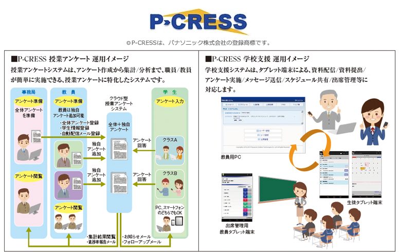 P-CRESSは、授業アンケートや学校支援、出席管理といったサービスで、学校様の授業運営を支援するシステムです。タブレット端末をクラウドで活用することで、職員の方の負担を軽減して学生/生徒側と教員側のコミュニケーションを強力にサポートします。