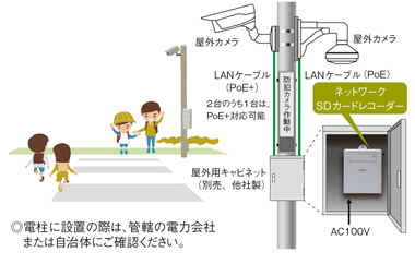 事故が多発する交差点や人通りの少ない路地などにカメラ2台とネットワークSDカードレコーダーを設置可能。カメラの電源工事不要/